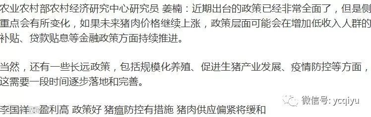 农业农村部农村经济研究中心研究员 姜楠:从短期来看,可以通过进口、金融、流通、储备肉投放等措施来稳定市场供应;从长期来看,要从促进生猪产业发展的角度,例如通过规模化养殖、提高流通效率等措施来促进生猪产业转型升级。