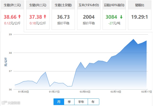 | 地区名称 | 外三元(元/公斤) | 内三元(元/公斤) | 土杂猪(元/公斤) | 玉米(元/吨) | 豆粕(元/吨) |