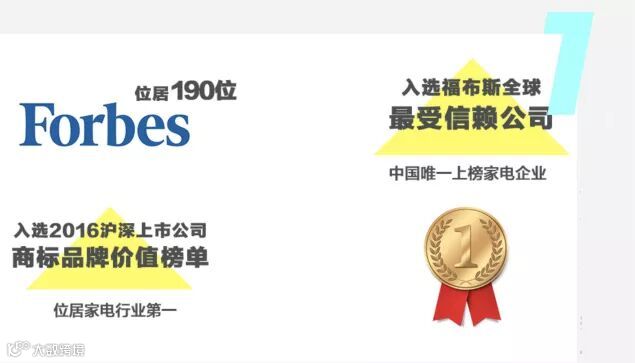成为“福布斯世界最受尊敬企业排行榜”中国家电行业唯一一家上榜企业;登上“沪深上市公司商标品牌价值排行榜”家用电器分榜第一;入选 “2017 CCTV中国十佳上市公司”;成为“珠海十大文化名片”;首批入选“新时代品牌强国计划”,并获“2017年度中国品牌奖”……