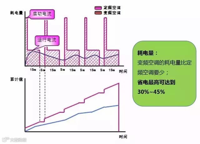 👉在8分钟时,变频空调的累计耗电量是定频的2倍;