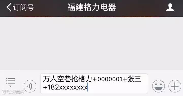 第二步:在2017年4月8日-9日活动期间,成功购机后在“福建格力电器”官方微信对话栏回复:万人空巷抢格力+抢购通行证编号+联系人+联系方式(四者缺一不可,回复不全则重新抽取)。