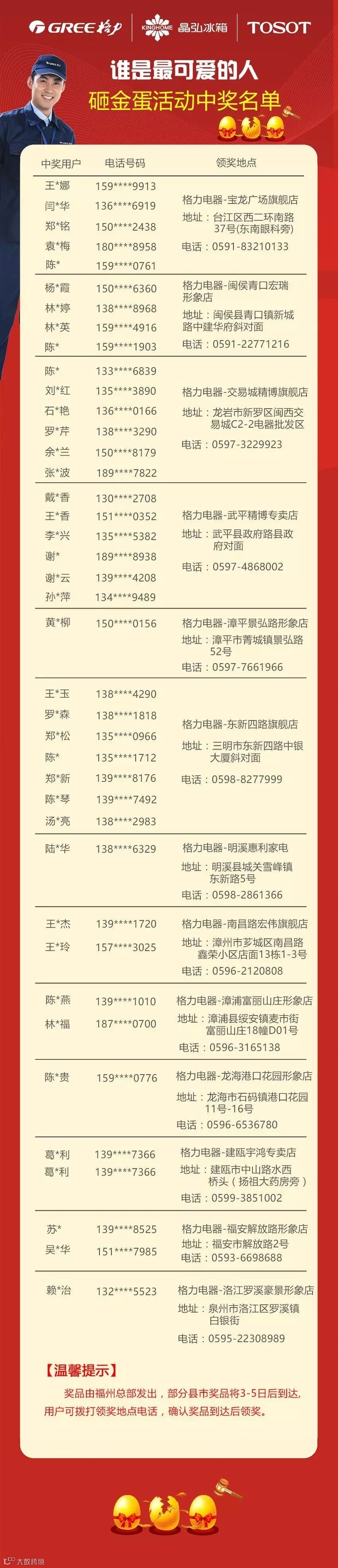 没有发现自己的名字?不要灰心,小编偷偷告诉你,大型促销活动“格力电器,工厂巡展”将在全省范围内开展,不仅有超低价空调,还有现场砸金蛋送大奖哦,尽请期待!