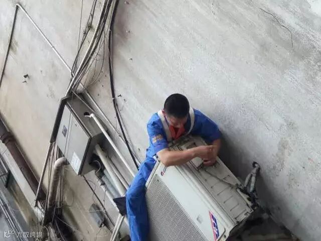 师傅小心翼翼地从防盗网开口处挪到安装点,没有手扶,仅仅依靠一根安全绳索来保障生命,然而师傅丝毫没有受到外界的影响,娴熟的安装技术与丰富的经验让他在户外活动还算自如。最终,经过两个小时的艰苦,顺利把空调装完成了。