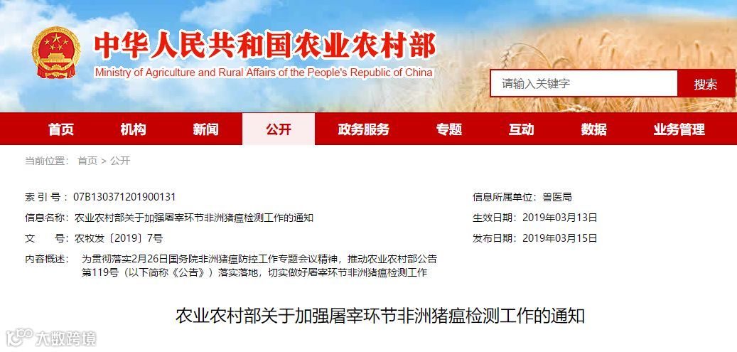非洲猪瘟是影响我国当前养猪业的最重要疫病,为了确保防控工作进一步顺利进行。2019年3月15日,农业农村部发布《农业农村部关于加强屠宰环节非洲猪瘟检测工作的通知》。通知中表示,农业农村部将于7月对各地落实屠宰企业非洲猪瘟检测和清理整改工作进行检查,检查结果将列入今年加强重大动物疫病防控延伸绩效管理指标体系。