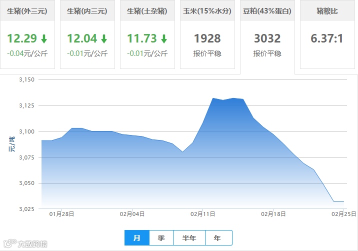 | 地区名称 | 外三元(元/公斤) | 内三元(元/公斤) | 土杂猪(元/公斤) | 玉米(元/吨) | 豆粕(元/吨) |