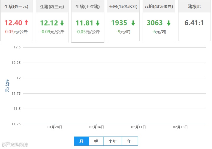 | 地区名称 | 外三元(元/公斤) | 内三元(元/公斤) | 土杂猪(元/公斤) | 玉米(元/吨) | 豆粕(元/吨) |