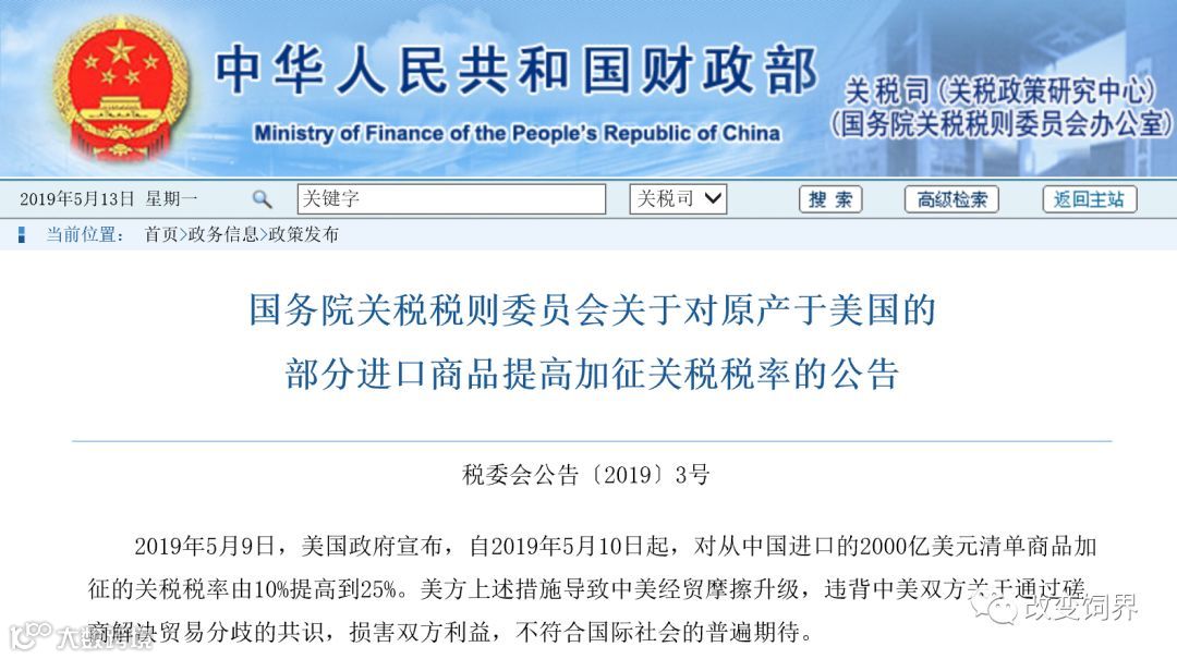 根据《中华人民共和国对外贸易法》《中华人民共和国进出口关税条例》等法律法规和国际法基本原则,国务院关税税则委员会决定,自2019年6月1日0时起,对原产于美国的部分进口商品提高加征关税税率。现将有关事项公告如下: