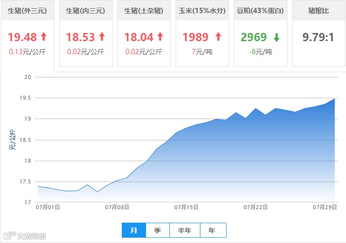 | 地区名称 | 外三元(元/公斤) | 内三元(元/公斤) | 土杂猪(元/公斤) | 玉米(元/吨) | 豆粕(元/吨) |