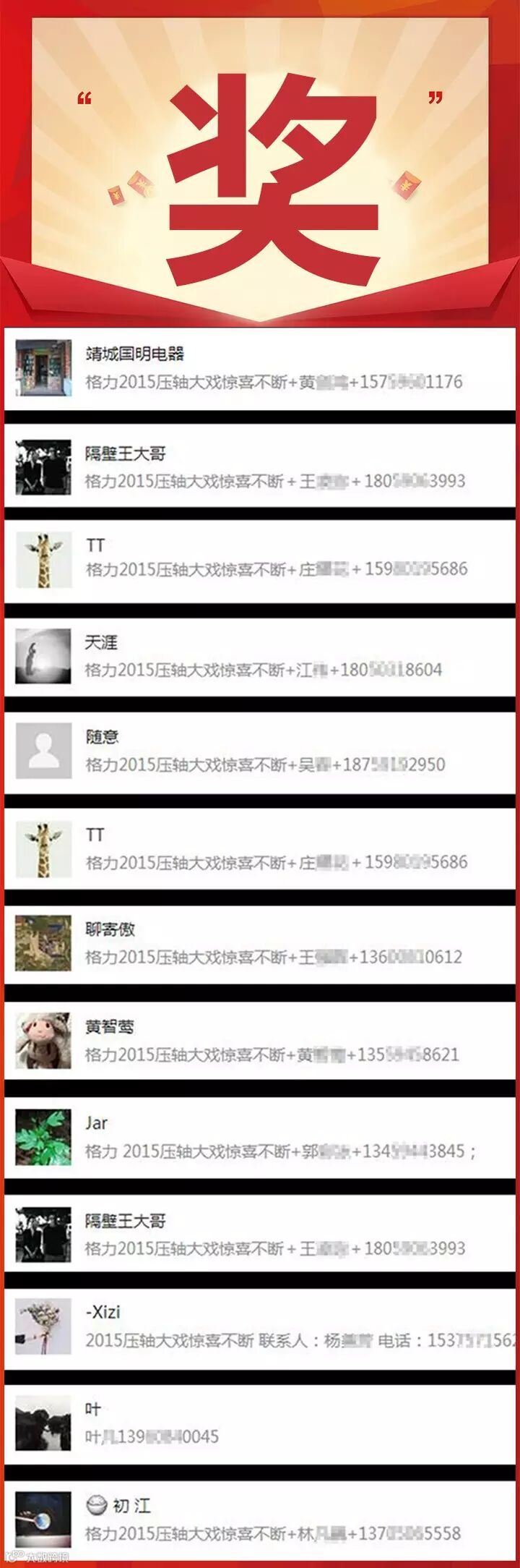 还记得吗?元旦那天的福利吗?“ 2015年格力压轴大戏 ” 今天到了开奖时间咯~没被选中的小伙伴不要气馁,下次小手指戳快点咯!好了,看看到底谁中奖了吧!