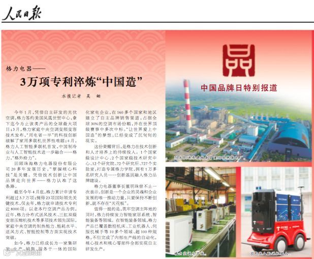 而在专版《格力电器——3万项专利淬炼“中国造”》一文,《人民日报》评价道,格力,“格外有力”!