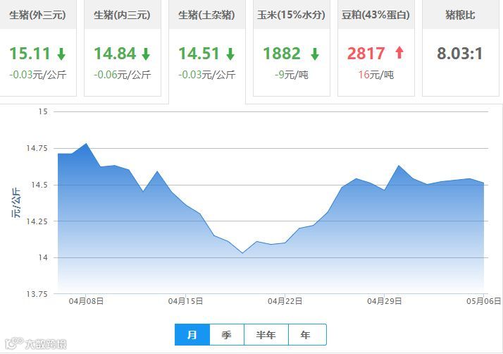 | 地区名称 | 外三元(元/公斤) | 内三元(元/公斤) | 土杂猪(元/公斤) | 玉米(元/吨) | 豆粕(元/吨) |