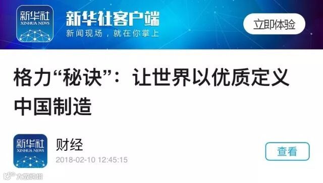 “质量,正是格力电器蜚声国内外市场的那个‘关键词’。”新华社发表的《格力“秘诀”:让世界以优质定义中国制造》如是评论,“格力式的发展,正是一条不断夯实质量基石的质量立身之路。”