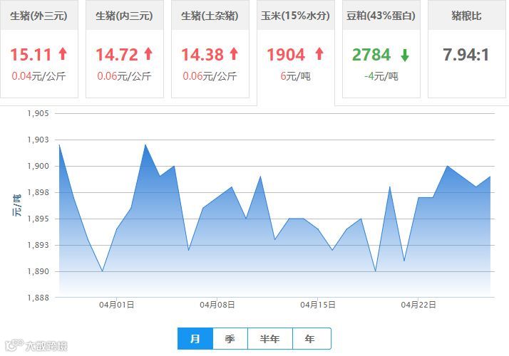 | 地区名称 | 外三元(元/公斤) | 内三元(元/公斤) | 土杂猪(元/公斤) | 玉米(元/吨) | 豆粕(元/吨) |