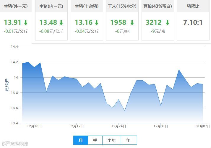 | 地区名称 | 外三元(元/公斤) | 内三元(元/公斤) | 土杂猪(元/公斤) | 玉米(元/吨) | 豆粕(元/吨) |