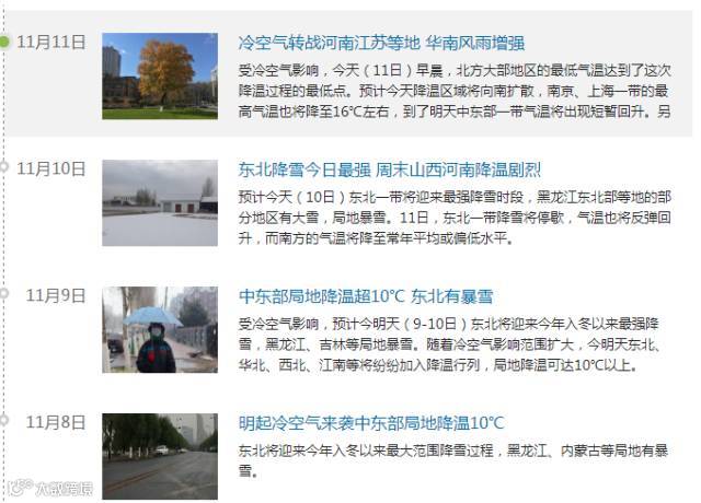 今天(11日)早晨,北方大部地区的最低气温达到了这次降温过程的最低点。预计今天降温区域将向南扩散,南京、上海一带的最高气温也将降至16℃左右,到了明天中东部一带气温将出现短暂回升。另外,受台风“海葵”影响,华南一带的雨水今明天将逐渐增多,未来三天江南一带的阴雨天气仍将持续。