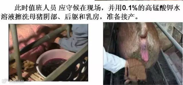 用湿毛巾擦净母猪外阴部周围,腹部及乳房,用0.1%的高锰酸钾消毒,接产人员要提前做好手臂和接产工具的消毒。
