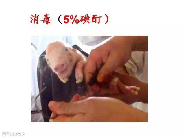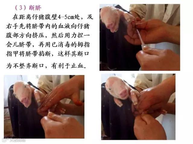 擦净口鼻及全身的粘液后立即断脐,断脐时,先用左手的拇指和食指在距仔猪脐带的基部5厘米处捏紧固定好,迅速用右手的拇指和食指将脐带中的血液反复向仔猪的腹部方向挤捏,直到脐带被挤捏部分看似无血为止,这时从左手固定处把脐带掐断,伤口处用5%碘酒涂抹消毒,以防感染。