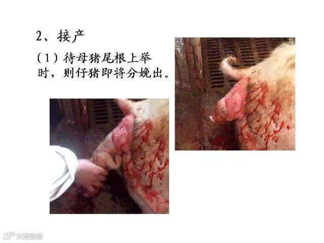 接产要求动作稳、准、轻、快,胎儿产出后,用左手托住胎儿,右手将连于胎盘的脐带轻轻扯出,然后迅速将仔猪鼻孔和口腔中的粘液清除干净,以防阻塞导致仔猪窒息,紧接着用抺布顺着仔猪毛的方向,由前向后,从上到下擦净仔猪全身的粘液,动作越快越好,产下一头,擦净一头。