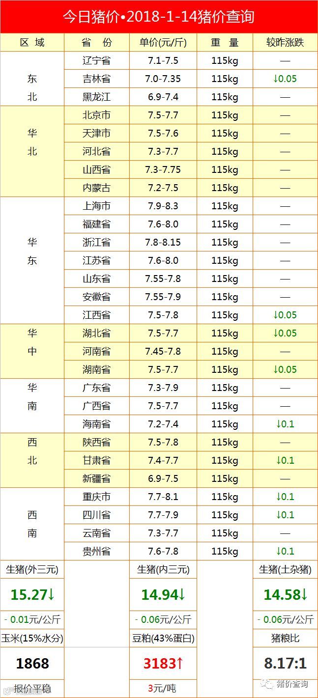 今日猪价•2018-1-14全国猪价