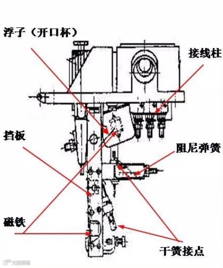 简单地说就是油箱内部产生气体,气体密度低上升积聚到瓦斯继电器顶部,然后顶部那个腔体的液面就下降,然后上面那个浮子跟着液面下降,上面的接点闭合,就报警了。