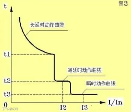 长延时部分为t=K/I²,具有反时限特性,电流越大,时间就越短。短延时部分为t2=λI2,瞬时部分为t3=λI3。这几个函数组合在一起,就成了上面的图像。