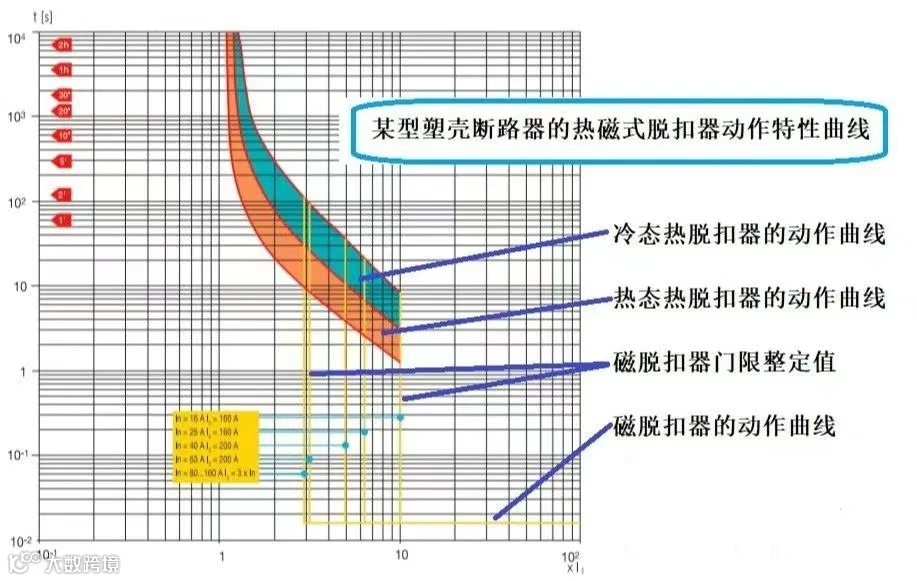 再看最上面这张图,横坐标是电流I,纵坐标为时间t,它是一个电流与时间的对应关系,被称为断路器的安秒特性曲线,但真正表述横坐标的是电流倍数,即实际电流I与额定电流In的倍数。