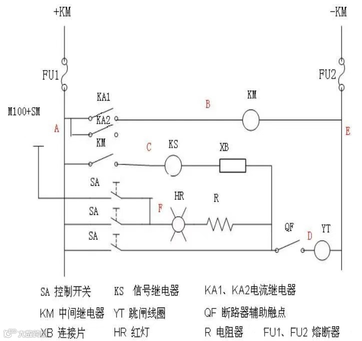 两点接地可能造成断路器误跳:A、B两点,A、C两点,A、D两点,D、F两点接地都可能造成断路器误跳。