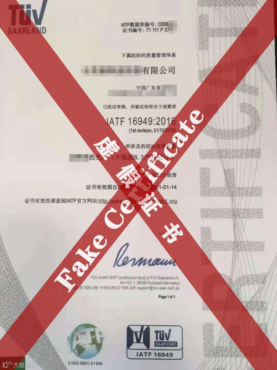 据知情人举报以及接汽车客户查询电话及邮件得知,有人在冒用我司TÜV Saarland的标志,假借TÜV认证的名义,出具虚假认证证书的情况。该侵权行为不仅严重干扰了认证行业的市场秩序,更侵害了我司以及我集团的名誉以及合法的权益。