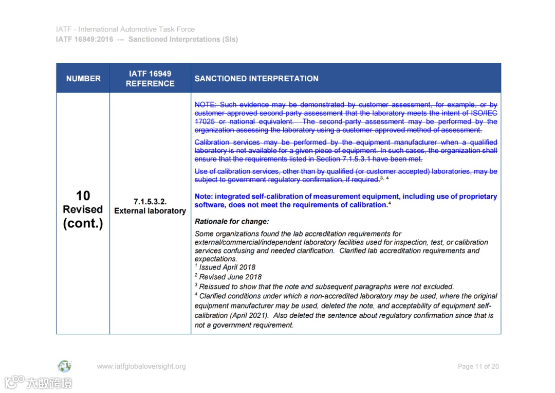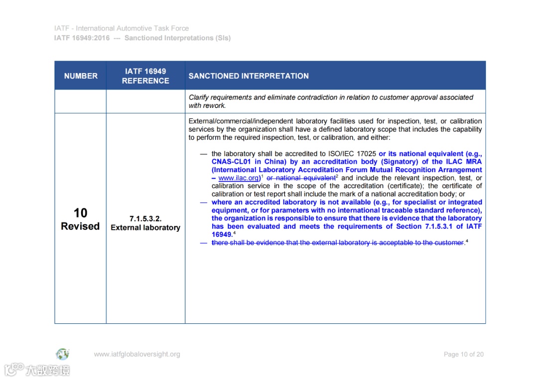 国际汽车工作组(IATF)在近日修订了IATF 16949:2016标准的SI 10(第10项认可解释),澄清了使用没有获得认可的外部实验室的条件。这将构成对条款“7.1.5.3.2外部实验室”的修订。修订后的条款如下斜体字所示(翻译供参考,非标准原文),其中与原始标准相比有更改的部分以蓝色突出显示。