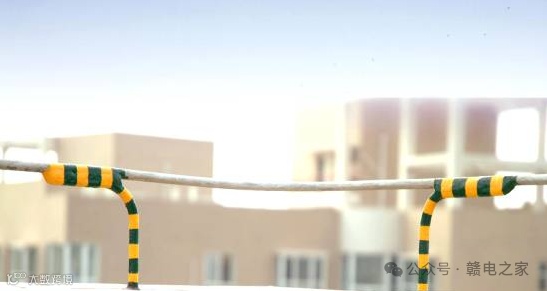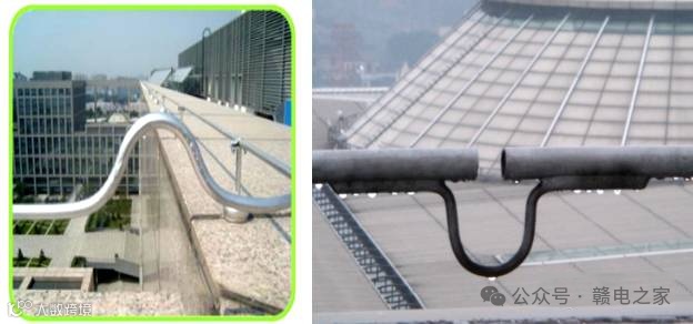 避雷线敷设平直、牢固,弧线流畅,支持件间距均匀,与 建筑物交接处收口美观。