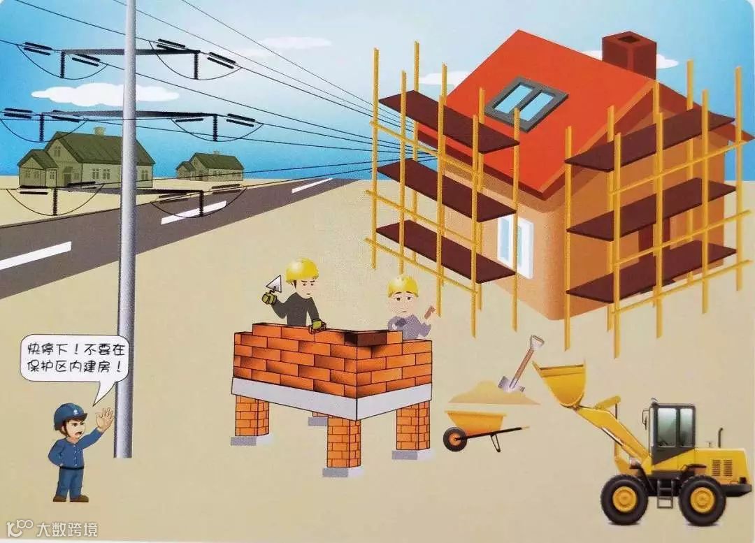 「那什么是电力设施保护区呢?电力设施保护区是指,电力线路外侧导线水平延伸并垂直于地面形成的两平行面内的区域:10千伏及以下为5米,35至110千伏为10米,220千伏为15米,500千伏为20米。」