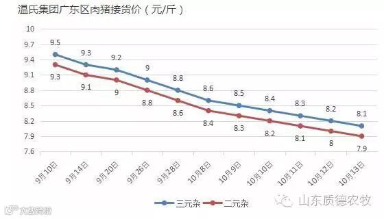 据养猪信息网监测数据显示:10月13日,猪价全国范围内出现不同程度下跌,平均猪价8.2元/斤,下跌0.06元/斤。跌幅度超过0.1元/斤的省市有11个,其中广东、广西、湖南、山西跌幅最大,达到0.17-0.18元/斤,广东一个月内已跌1.33元,降幅超过全国平均水平,达14%。东北、华北地区已全面进入7元时代。