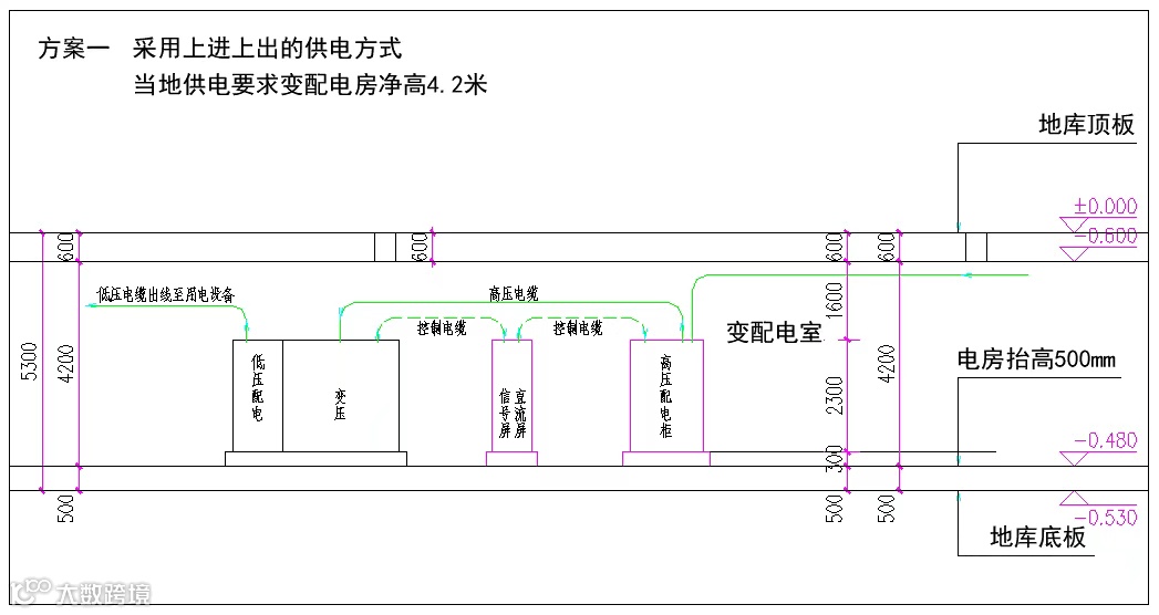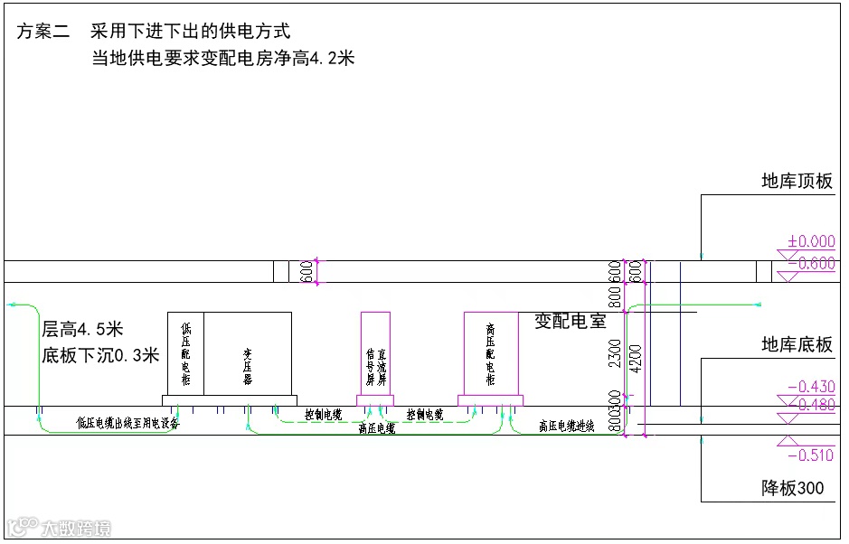 注明:下进下出方式利用底部电缆沟800mm的高度做电房抬高面,满足变配电房地面完成面需比地库完成面高500mm的要求