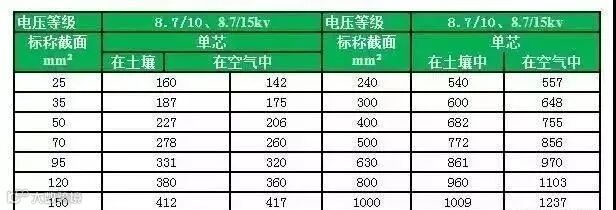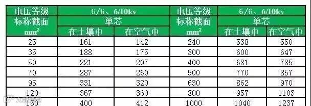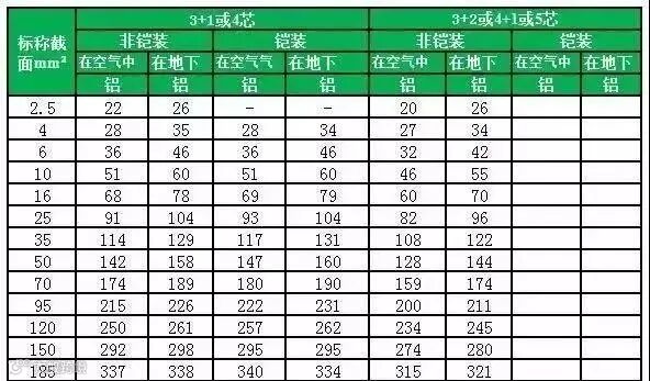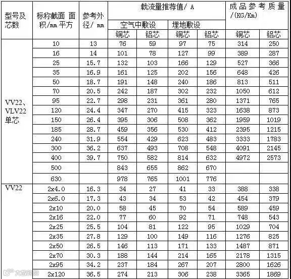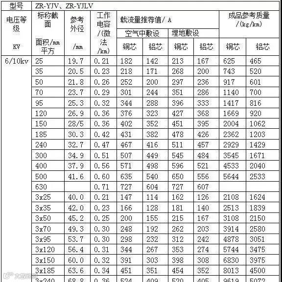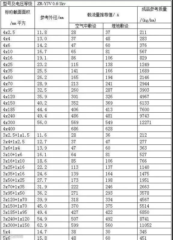 常见ZR-YJV电力电缆载流量表