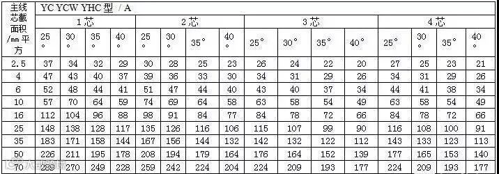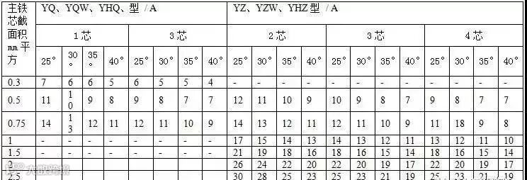通用橡套软电缆的载流量(450V/750V及以下橡胶绝缘电力电缆YQ、YQW、YHQ、YC、YCW、YHC型号的载流量