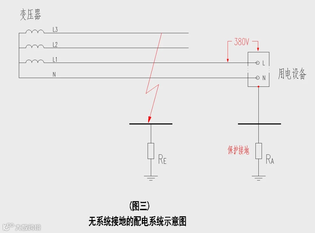 为啥要做系统接地呢?下面咱们用一张图来分析分析。(图三)这是没有系统接地的配电示意图。要是 L3 相线发生接地故障了,图里给用电设备供电的 L1 相线跟设备外壳之间的电压,就从 220V 升到 380V 啦,这就相当于从原来的相电压升到了线电压。