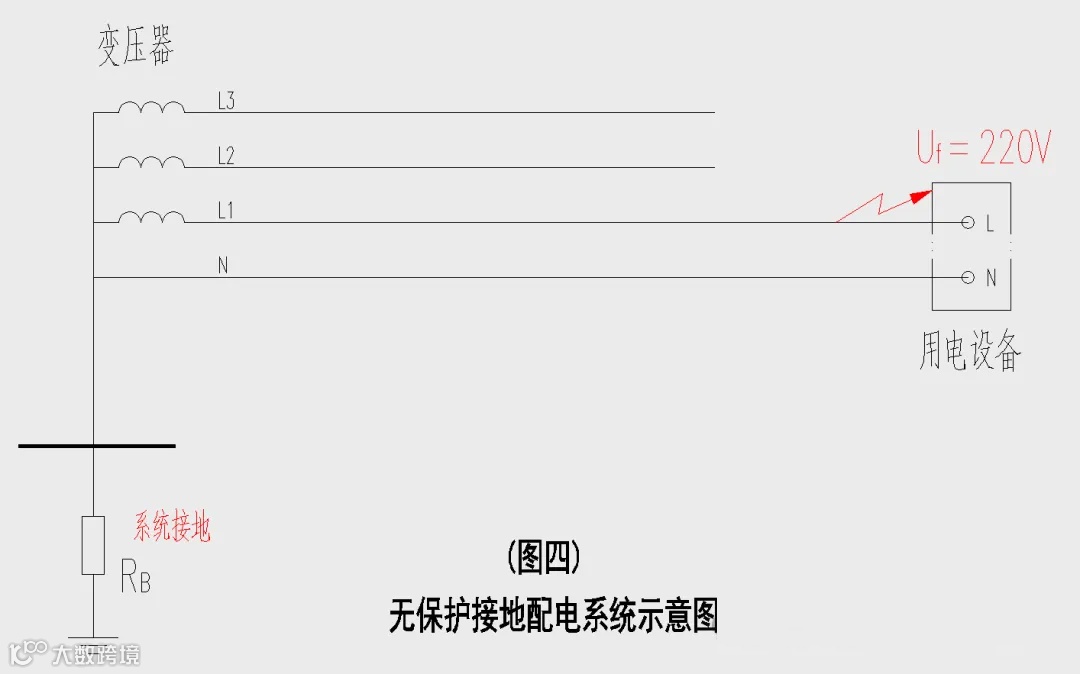 做了系统接地后,为啥还要做保护接地呢?下面咱们还是用一张图来分析分析。(图四)这是有系统接地但没有保护接地的配电示意图。假如 L1 相线在用电设备那儿发生碰壳故障,因为没做保护接地,所以故障电流没法回到变压器的中性点,这样保护电器就不会有动作,那用电设备的金属外壳上就会带着 220V 的危险电压,这可就会引发电击的危险啦。