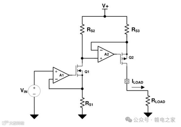 这个高压侧电压电流转换电路能够很好地为接地负载提供可调节的电流。电路结构采用两级设计,第一级采用OPA+NMOS,把VIN转换为电源参考信号来驱动第二级OPA,第二级OPA通过控制PMOS的栅极来调节负载电流。