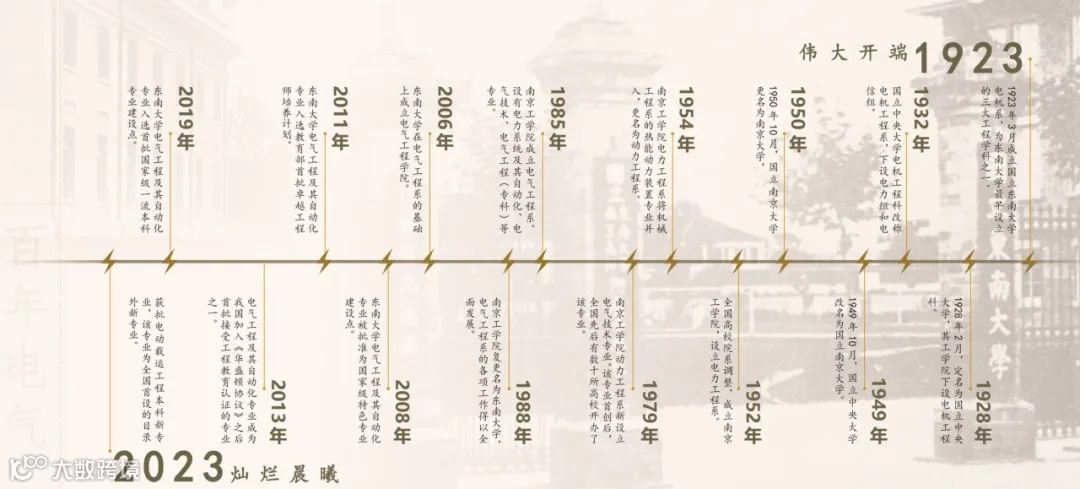 东南大学电气工程学院(简称“东大电气学院”),始于1923年成立的国立东南大学电机系,是东南大学最早设立的三大工程学科之一。100年来,历经国立中央大学时期名家荟萃西迁巴蜀时期饱经沧桑,新中国建立初期充实调整南工时期革故鼎新,复名东大后再展华章,新时代以来砥砺奋进,东南大学电气工程学院已发展成为我国一流电气人才和创新成果的重要培育基地。