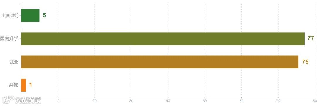 本科毕业生去向落实率为99.37%,升学率为51.90%;硕士毕业生去向落实率为100%,直接就业率为97.89%,升学率为2.11%;博士毕业生去向落实率为100%,其中国内就业率为84.21%,出国(境)率为15.79%。