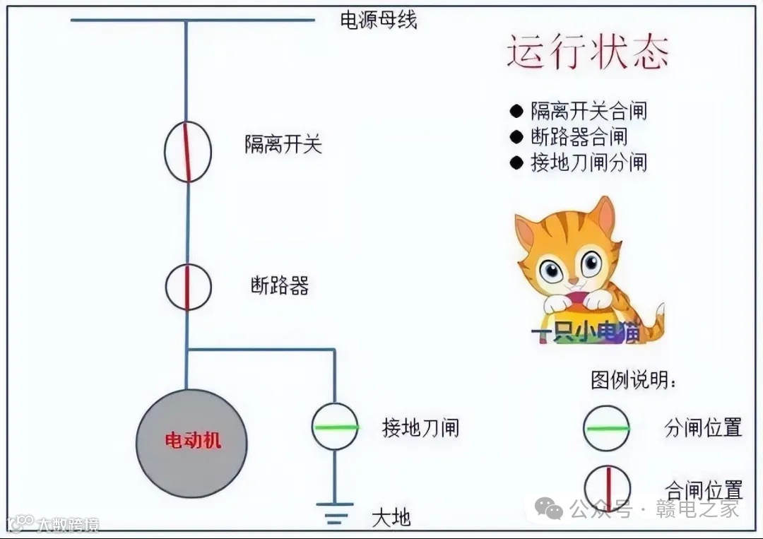 运行状态,运行状态是指【电气设备的隔离开关及断路器都在合闸状态,接地刀闸在分闸状态】,此时电源已经过隔离开关及断路器送至被驱动的电气设备,该被驱动的电气设备已经在工作。