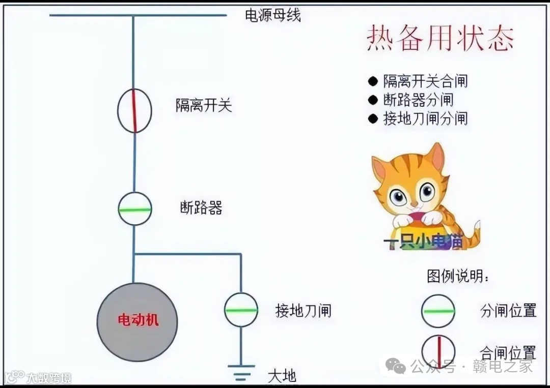 接着是热备用状态。这种状态表示电气设备已经具备了运行的所有条件,但是还没开始充电操作;设备连接的每一边都只有一个断开的地方;同时,继电保护、自动装置和控制电源也都处于能让设备运行的状态。再瞧瞧冷备用状态。
