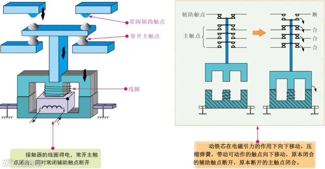 接触器主要包括线圈、衔铁和触点几部分。工作时,核心过程即在线圈得电状态下,使上下两块衔铁磁化相互吸合,衔铁动作带动触点动作,如常开触点闭合、常闭触点断开,如图2所示。