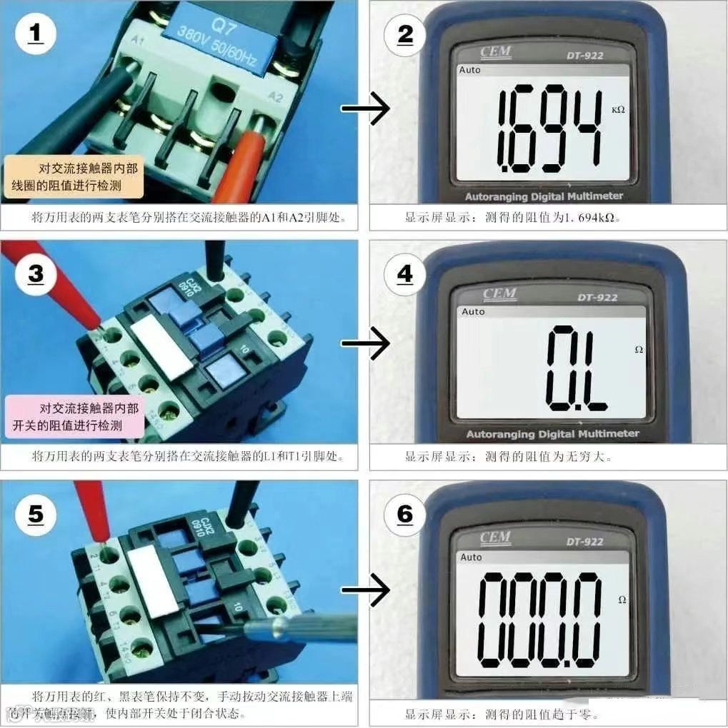 检测接触器可借助万用表检测接触器各引脚间(包括线圈间、常开触点间、常闭触点间)的阻值,或在路状态下,检测线圈未得电或得电状态下,触点所控制电路的通断状态来判断性能好坏。图3为交流接触器的检测方法。