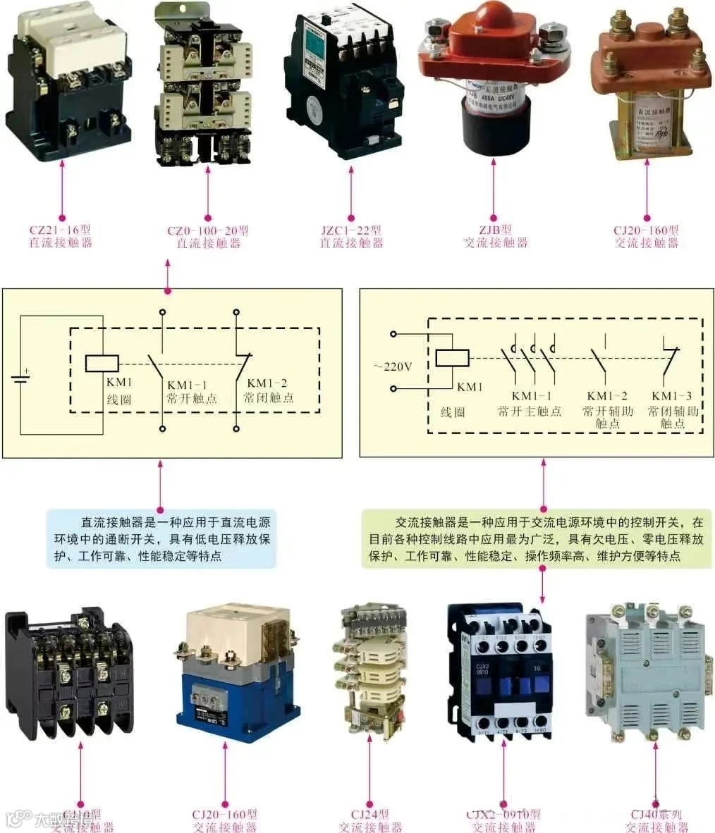 在实际控制线路中,接触器一般利用主触点接通或分断主电路及其连接负载,用辅助触点执行控制指令。在水泵的启停控制线路中,控制线路中的交流接触器KM主要是由线圈、一组常开主触点KM-1、两组常开辅助触点和一组常闭辅助触点构成的。