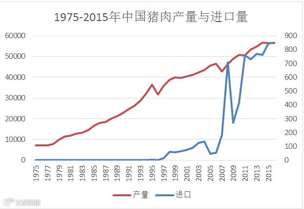 图1 1975-2015年中国猪肉产量与进口量单位:千吨