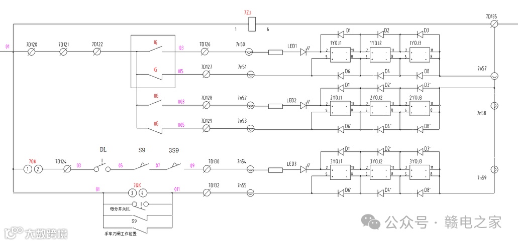 若需要完成解列,则需要将分段开关位置(DL)、分段手车刀闸位置(S9)、分段隔离手车刀闸位置(3S9)的另一副常闭接点,以及并列把手(7QK)的解列接点3-4进行并接,当任意一对接点闭合,即完成解列。