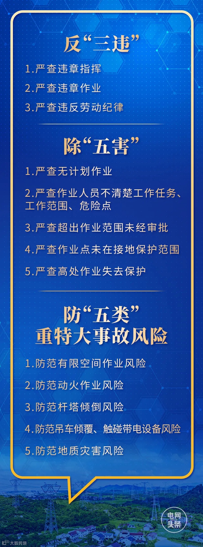 “五类”重特大事故风险是指有限空间作业、动火作业、杆塔组立作业、吊装作业、地质灾害等情况下的群死群伤风险。防“五类”重特大事故风险需要全面掌握作业计划、准确辨识作业风险、针对性制定和落实管控措施。