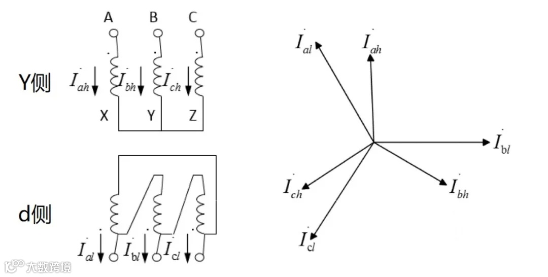 以YN-d11接线为例,接线图与电流相量图如图3所示。可见,因高低侧同相相量有30°角度差,故正常运行时两电流矢量和不为0,需先相位转换,转换后同一相高低侧两相量同相位,继保小家,一个学技术的公众号。