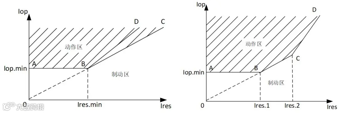 两段折线式比率制动曲线如图4左图所示,曲线可以是通过原点的ABC型,也可以是不通过原点的ABD型。大部分装置为ABC型,继保小家,一个学技术的公众号。